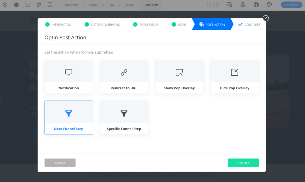OptimizeFunnels adds a series of additional options to the OptimizeBuilder that means you can link opt-in forms, images, text, etc. to any of the pages in your funnel using our funnel steps settings.