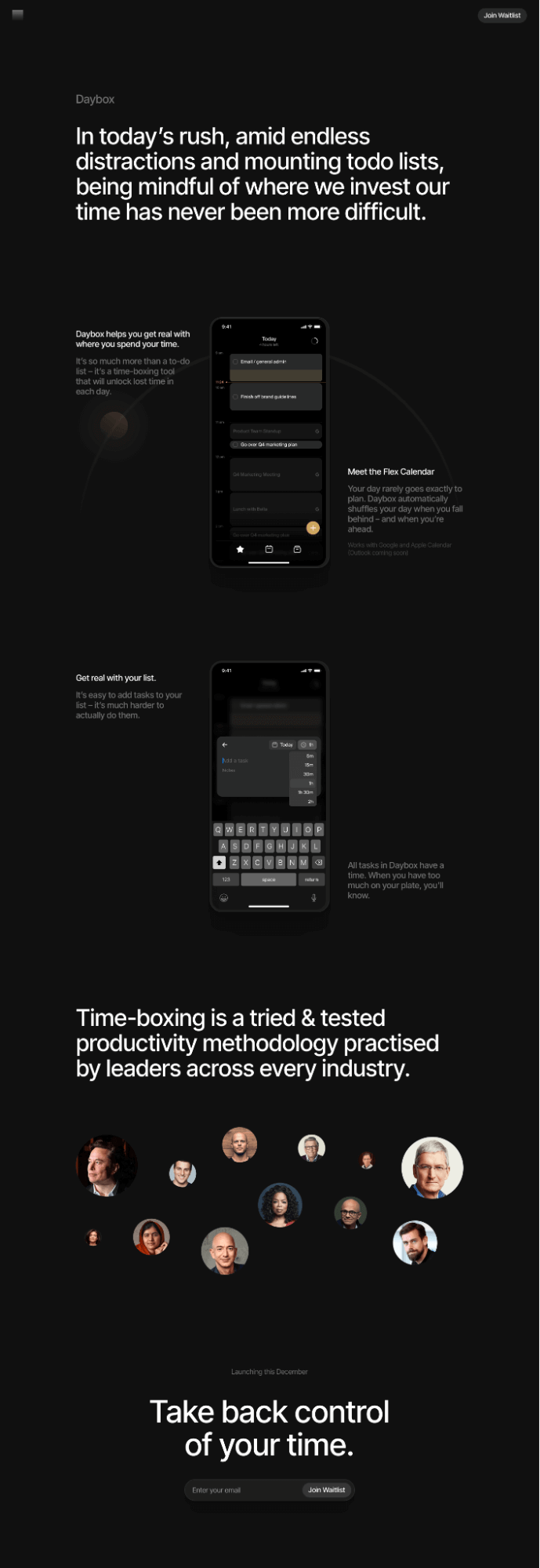 Daybox's coming soon landing page is a great example of how using diverse images can benefit the pre-launch of your product. Each of the different images used focus on a specific benefit, making it easier to show key selling points of the product.