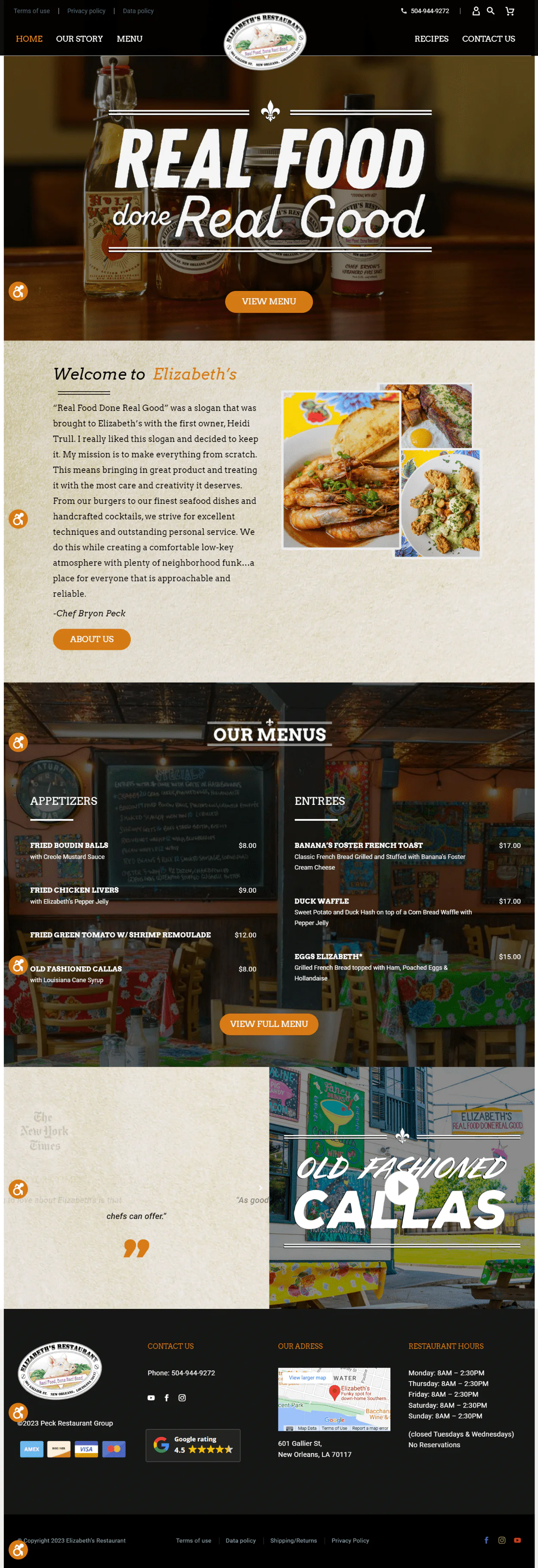 Elizabeth's Restaurant, located in New Orleans, prides itself on "Real Food Done Real Good." Under the guidance of Chef Bryon Peck, the restaurant emphasizes making everything from scratch, ranging from burgers to seafood dishes and handcrafted cocktails.