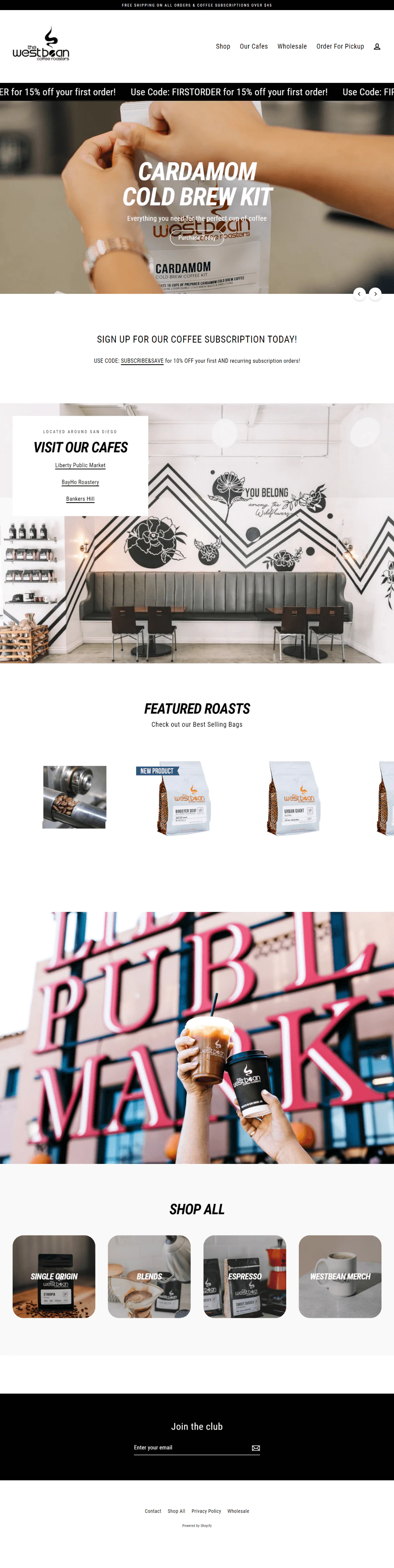 The West Bean Coffee Roasters offers specialty roast coffee with various blends and single-origin options. They provide coffee products like the Cardamom Cold Brew Kit and the Guatemala Rosalio Villatoro specialty roast.