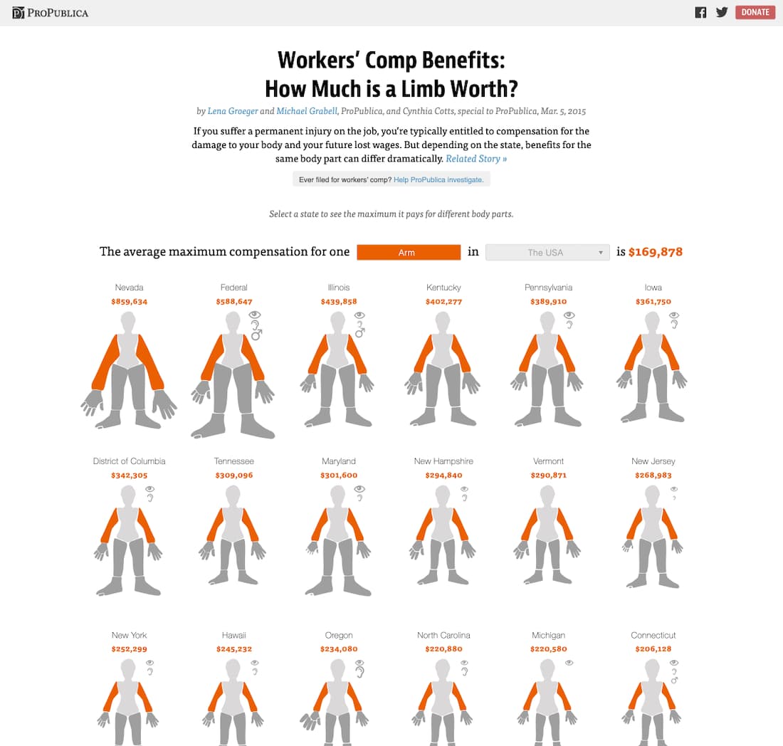 An interesting but rather morbid example of a microsite, investigative journalism website ProPublica created an interactive microsite showing average compensation values for limb loss in different states of the USA.