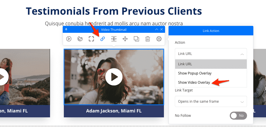 To use the new Video Popup click on the element you want to link and choose Show Video Overlay.